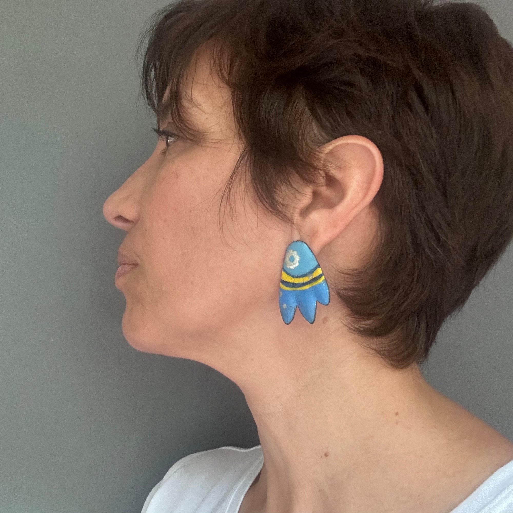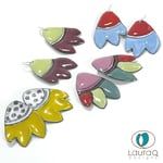 Vitreous enamel flower earrings, meticulously hand painted in bright colors . 1.5" long by 1" wide . The French hook version is .25 " longer.