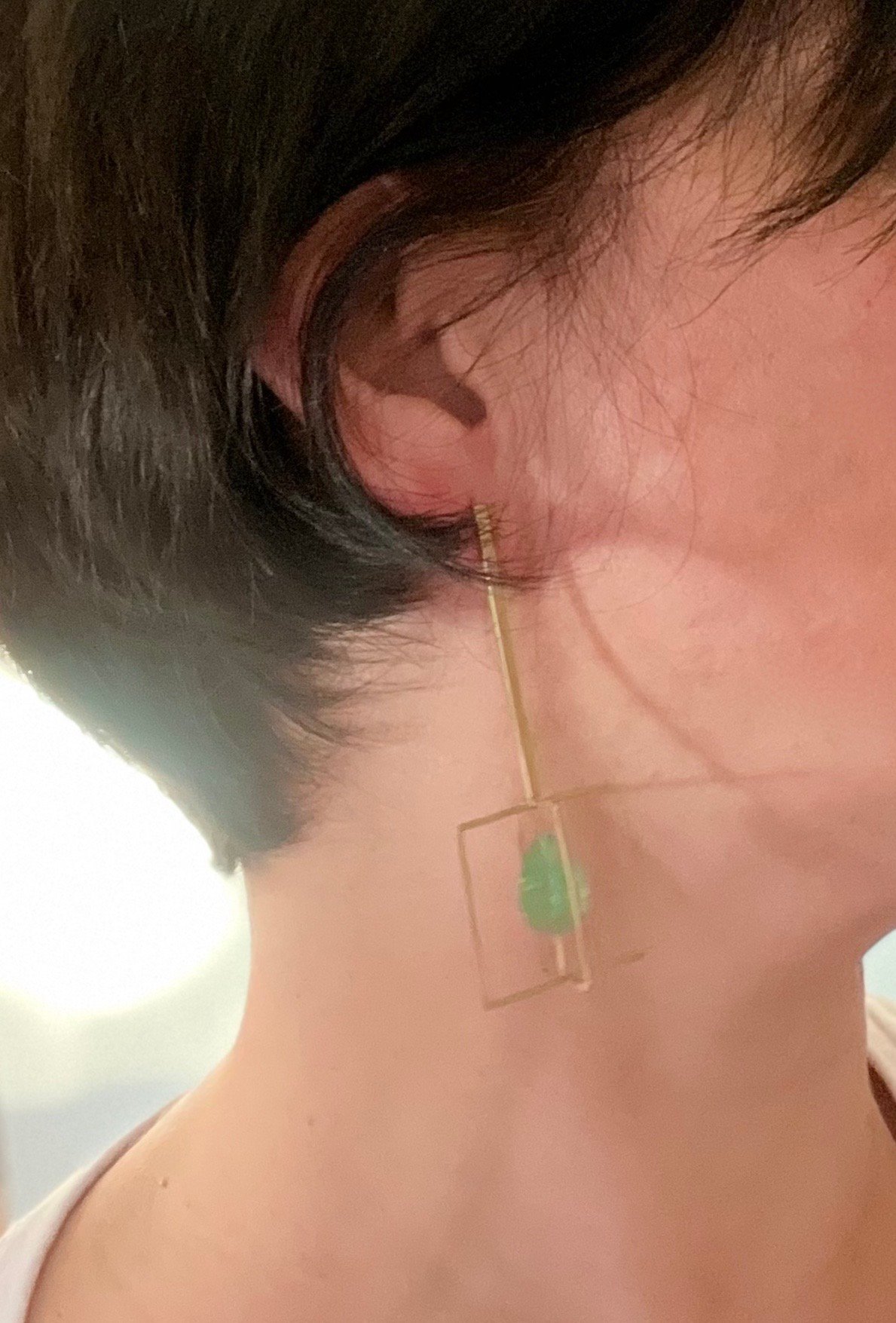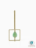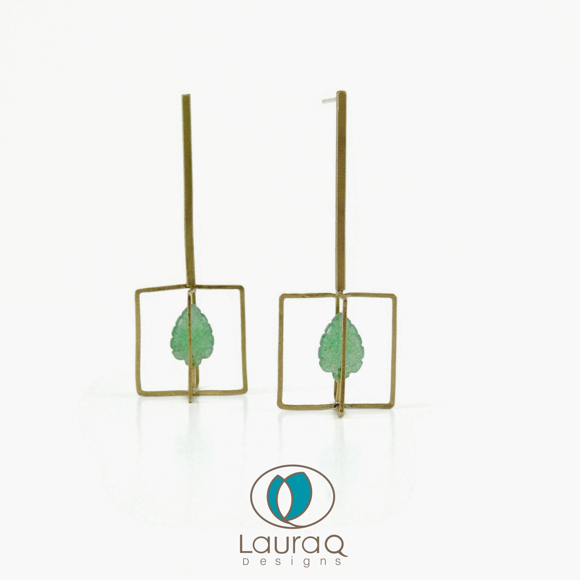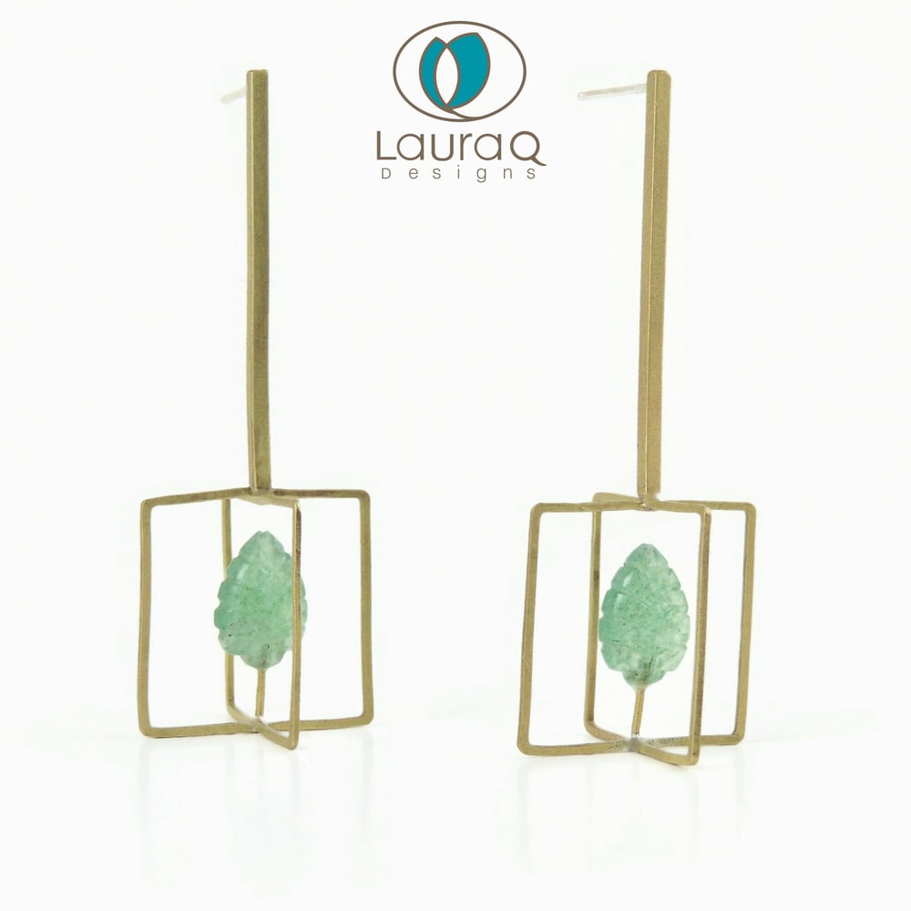 .Beautifully hand fabricated square brass earrings protecting a green tree. The tree has been hand carved in green quartz and stands in the center of the cage. The brass has been powder coated to inhibit oxidation giving it a golden hue. The total length is 3¨long by 1¨ wide. Posts and backings are sterling silver.