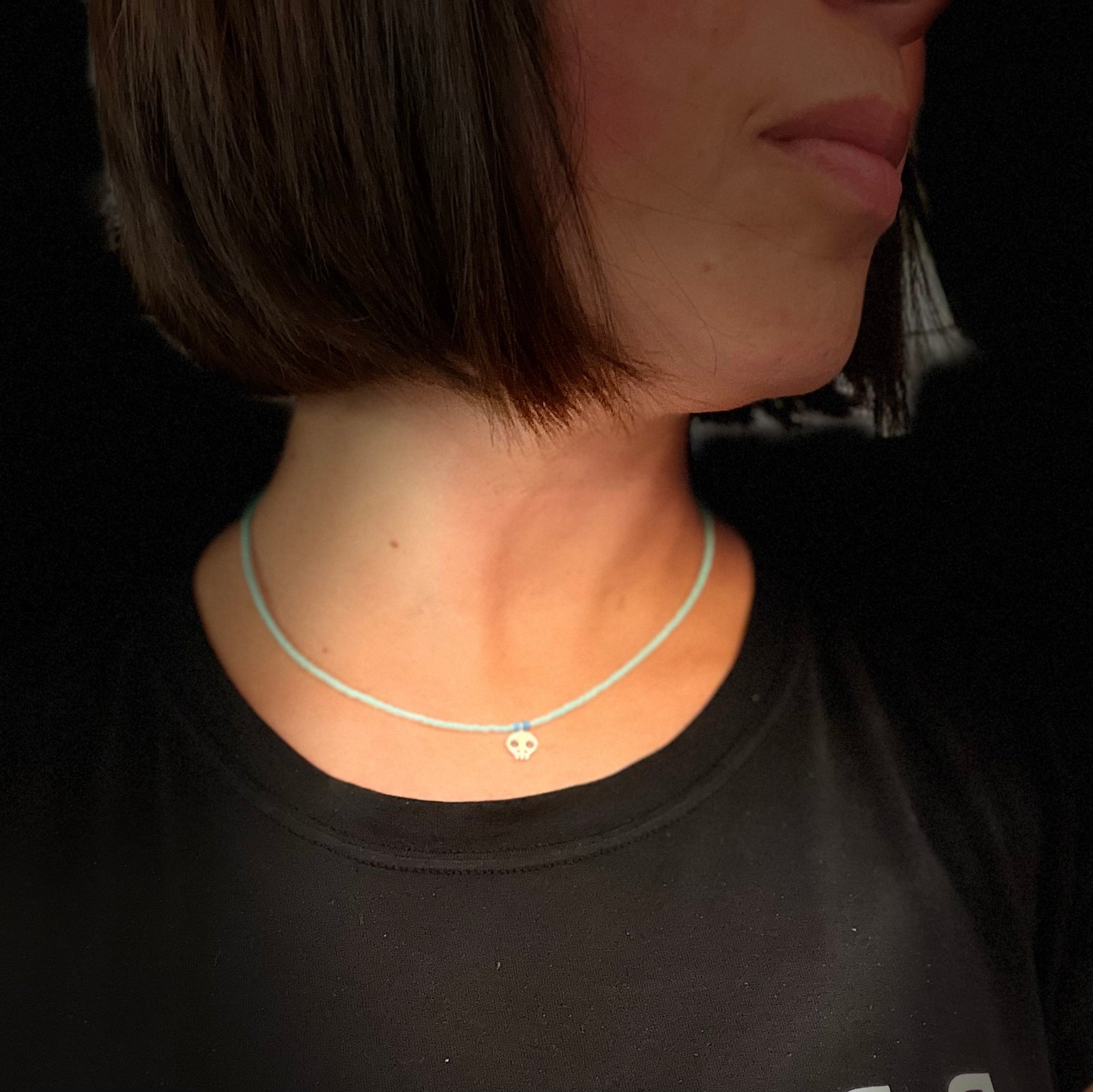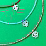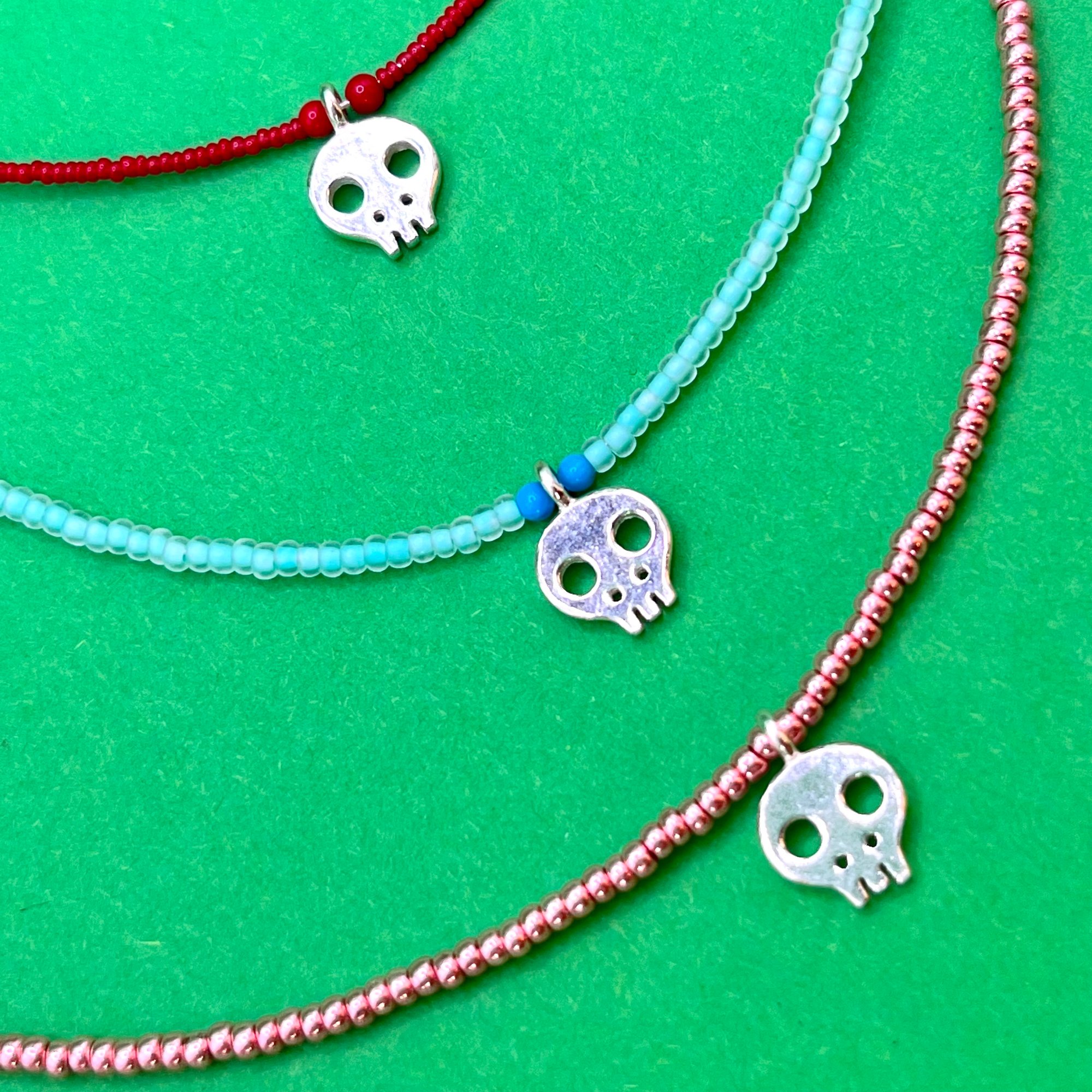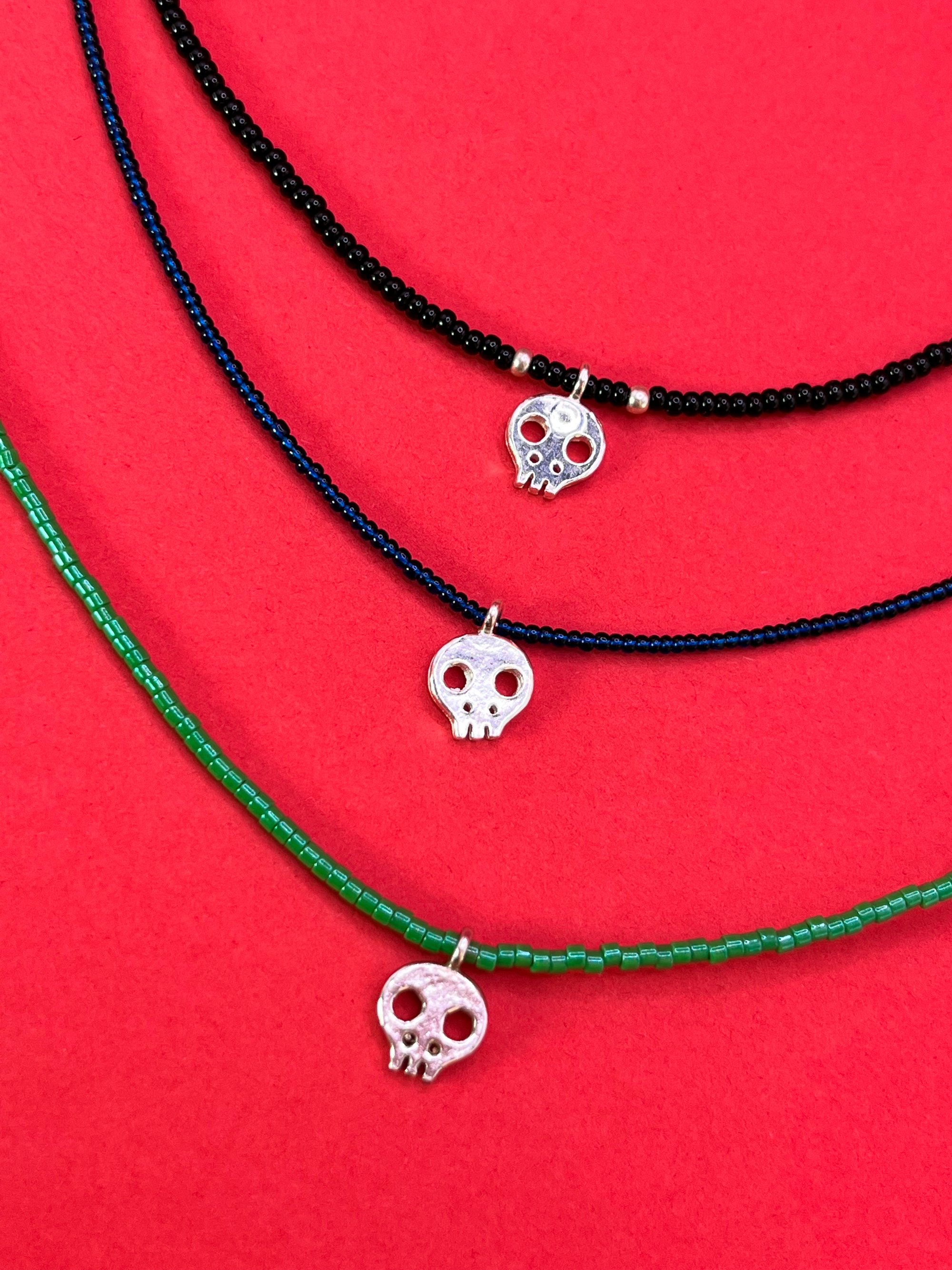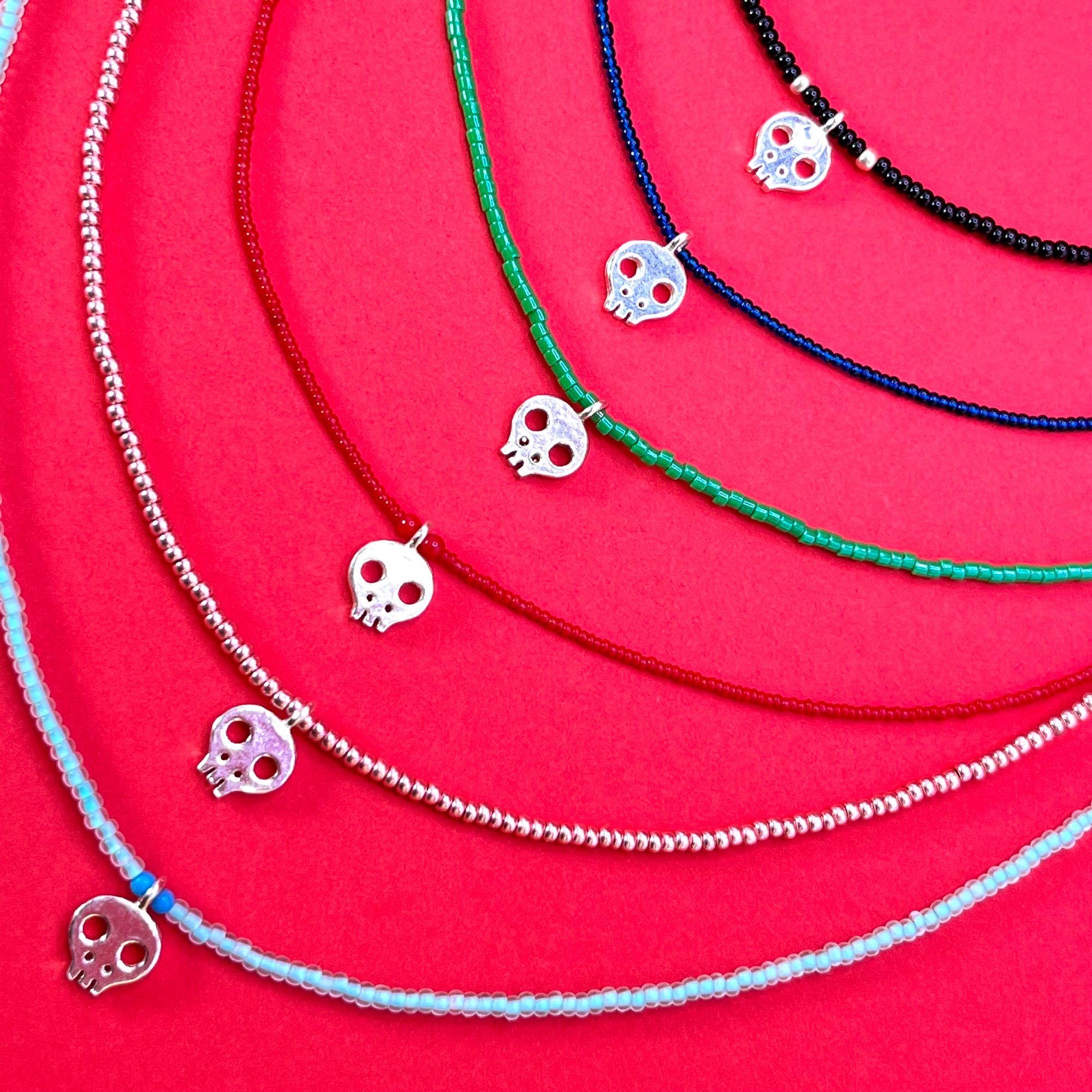 Too cute to pass up... Sterling silver tiny skulls , measuring 3/8"round and 1/16" thick (8mm x 2mm thick) The necklaces are 16"- 18" long in various glass bead colors with sterling clasp and chain. See below under options.