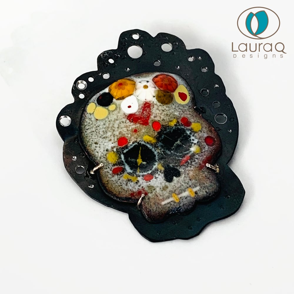Vitreous enamel on copper sugar skull set on fabricated steel backing brooch. This pretty lady measures 2.5” long by 2” wide with a depth of 1/4”. Theres a great 3 dimensionality to the enamel piece itself , with indented eyes and bumpy mouth.