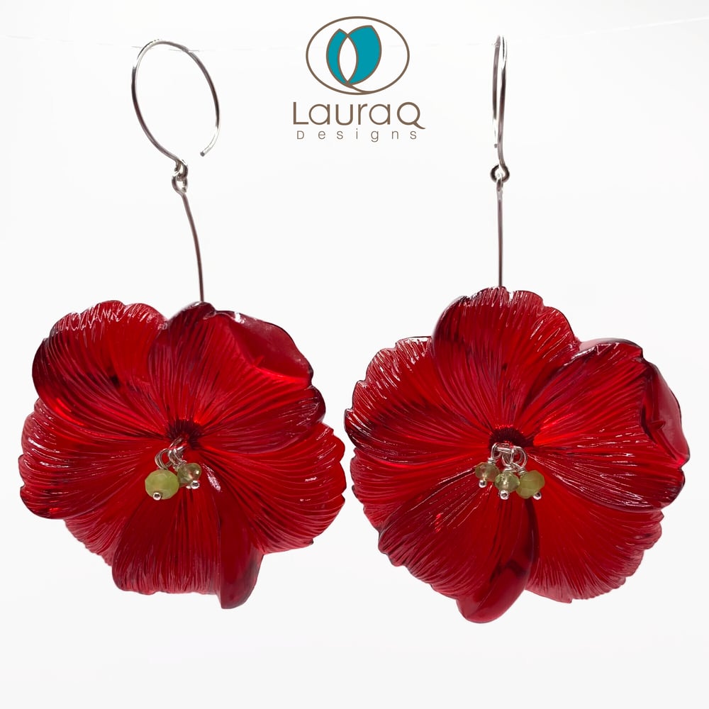 Luscious clear red lucite flower earrings with peridot rondelles in the center.