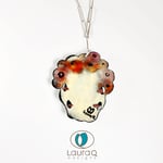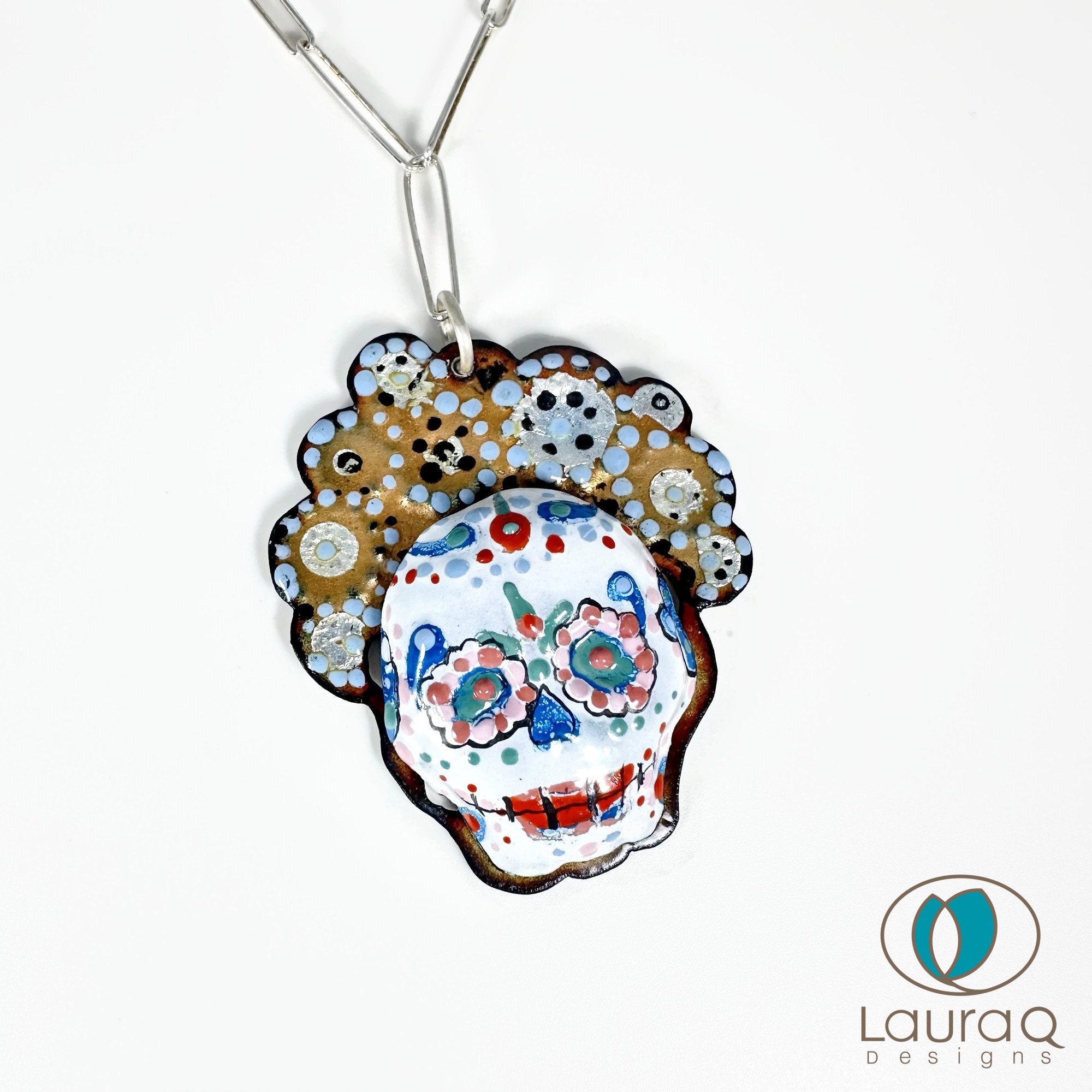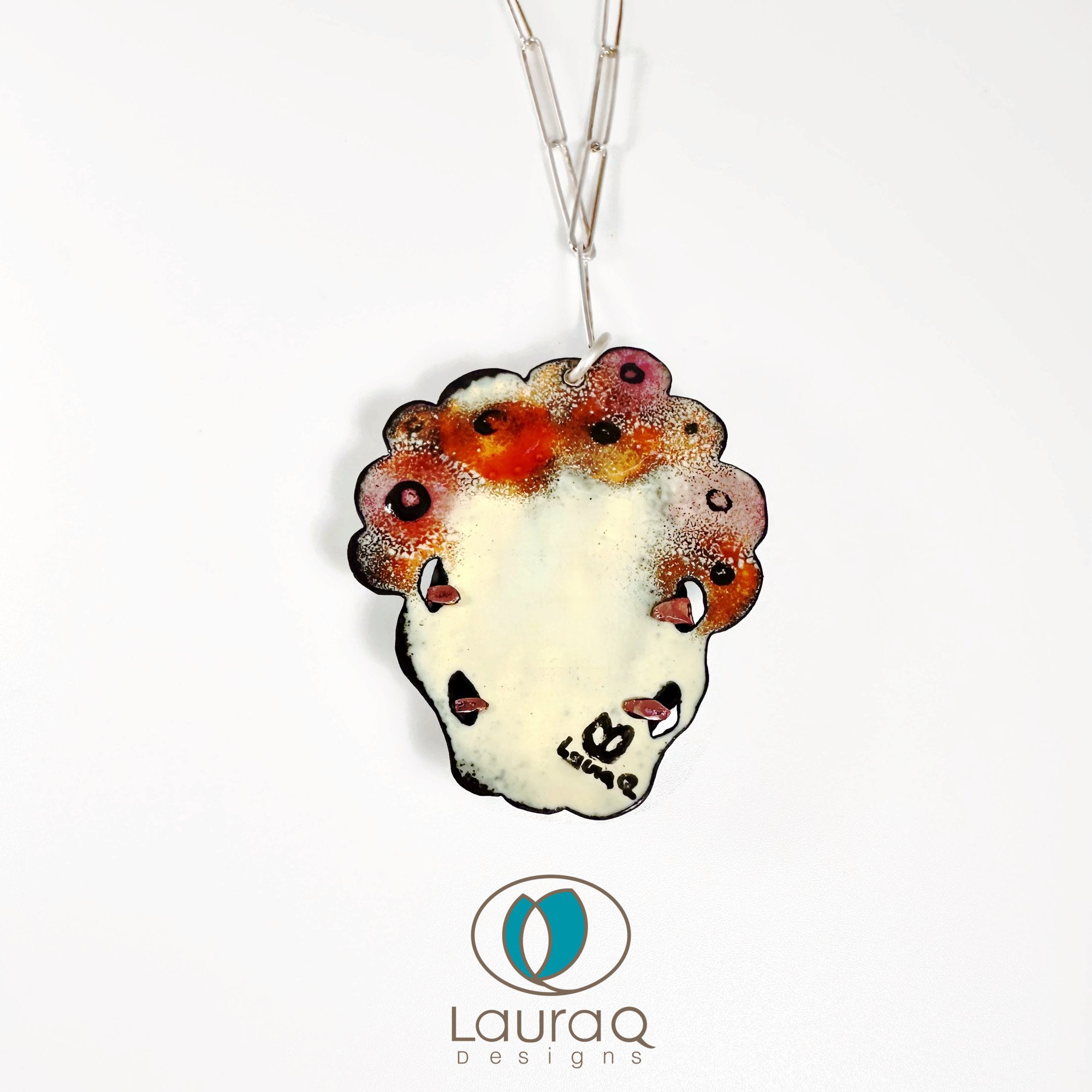 Hand made paper clip linked sterling chain at 20" in length with a. beautiful three dimensional vitreous enamel pendant 3 inches long, 2.75" wide and .75"deep carefully detailed sugar skull with details of fine silver on its crown of flowers. The back is colorful and signed by Laura Q. Truly one of a kind piece to wear all year round.
