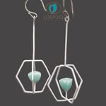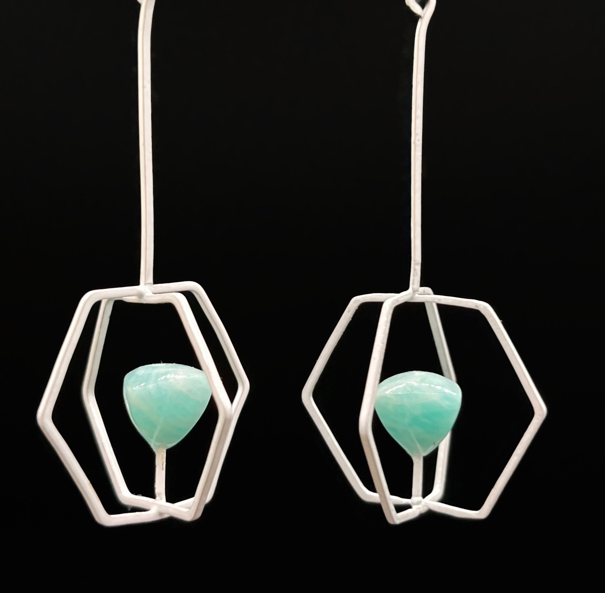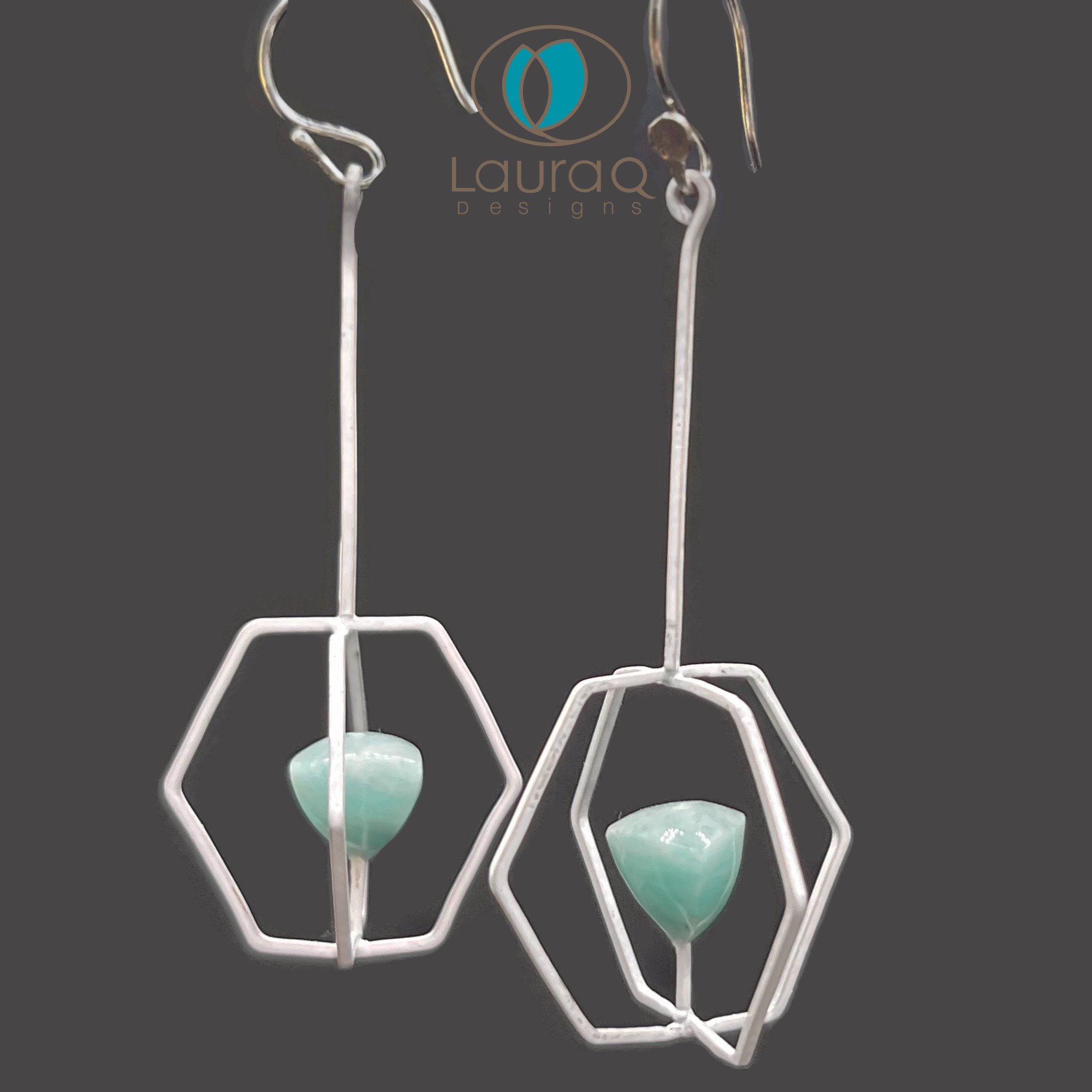 Sweet and delicate looking brass cages powder coated in white with a hand carved trillion stone in beautiful Amazonite blue. The earrings hang from Sterling silver hooks and are 2¨long by .75¨wide. *see size reference photo*